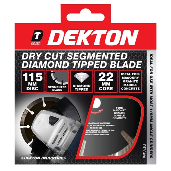 Dekton dry cut diamond tipped blades are ideal for masonry, granite. marble and concrete. The blade is segmented and the diamond tip adds extra durability.